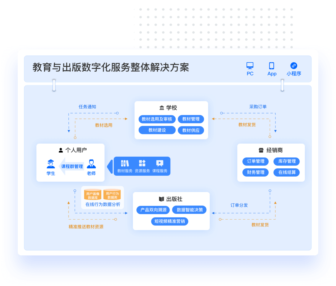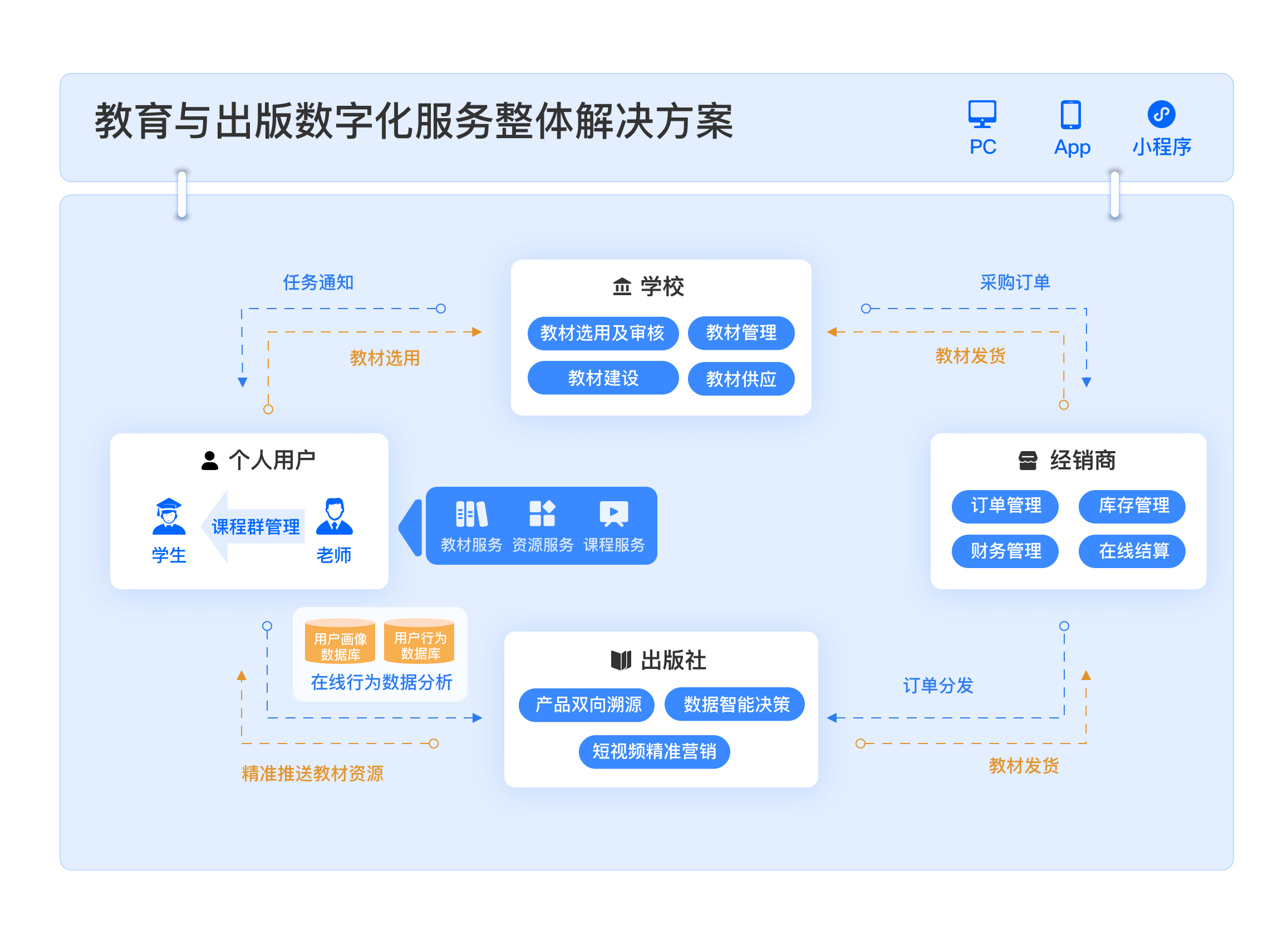 在大学教材管理、教师讲义编写、数字出版、平台分发和学生订购五大应用 场景中分别嵌入审批和采购、数字教材编辑阅读器,为目标用户提供从数字 教材内容生产出版到平台分发再到数字化学习的整体解决方案,全面推动了教育出版深度融合协同发展