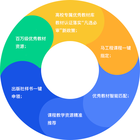 百万级优秀教学资源;高校专属优秀教材库,教材认证落实“凡选必审”新政策;马工程课程一键指定;优秀教材智能匹配;出版社样书一键申领;课程教学资源精准推荐