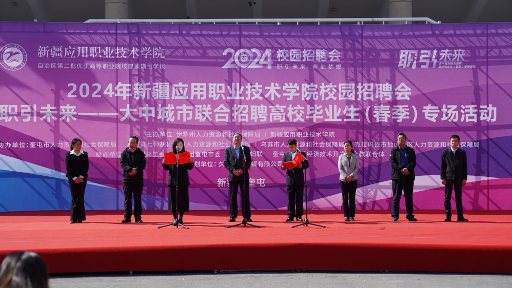 学院党委副书记、院长叶列吾别克·那克斯别克出席活动并致辞。学院党委委员、副院长巴吾东·买买提主持开幕式。本次招聘会由伊犁州人力资源和社会保障局与新疆应用职业技术学院主办,奎屯市、兵团第七师胡杨河市、克拉玛依市独山子区以及奎屯-独山子经济技术开发区等人力资源和社会保障局及相关部门协办。