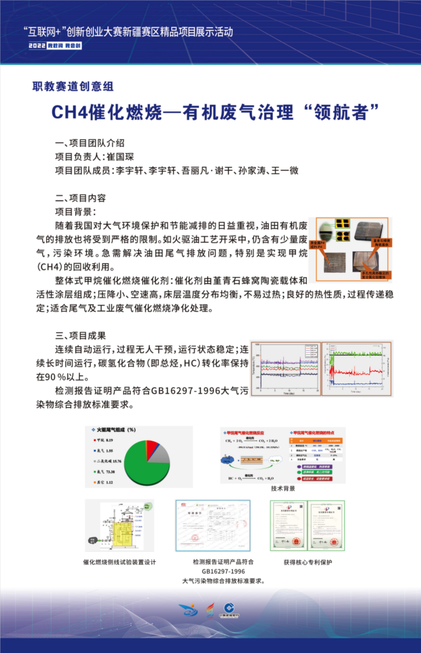 在刚刚结束的第八届中国国际“互联网+”大学生创新创业大赛新疆赛区总决赛中,我校石油与化学工程学院李国峰老师团队《CH4催化燃烧—有机废气治理领航者》项目斩获新疆赛区职教赛道创意组金奖,首次实现了我院在该比赛中金奖零的突破。该项目核心团队成员均为石油与化学工程学院不同专业大一、大二学生,他们优势互补、团结合作。团队按照学院的备赛安排,经过将近一年的准备时间,历经多轮训练打磨和30余次的修改完善,最终获得自治区金奖。