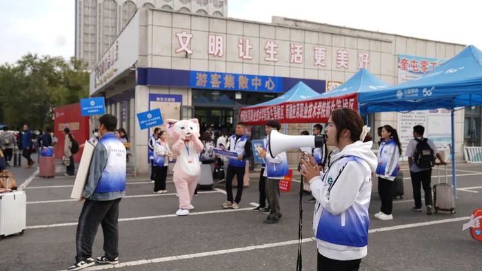 在火车站的熙熙攘攘中,一抹学院的色彩格外引人注目,充满了温暖与活力。清晨的第一缕阳光还未完全驱散夜的凉意,但火车站的出口处早已被新应职的迎新队伍占据。他们身着统一的志愿者服装,手中高举着写有学院名称和欢迎词的指示牌,脸上洋溢着热情的笑容,仿佛是这座城市的第一道光,为初来乍到的新生们照亮方向。